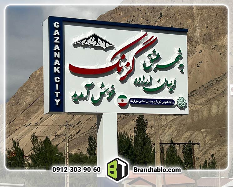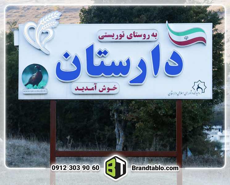 - تابلو ورودی روستا: این تابلو بهعنوان اولین تصویر از روستا اهمیت زیادی دارد. طراحی آن معمولاً با الهام از المانهای بومی انجام میشود و متریالی چون سنگ، چوب یا فلز در ساخت آن استفاده میشود. تابلوهای چلنیوم و استیل با نورپردازی نیز امروزه محبوبیت بالایی دارند.